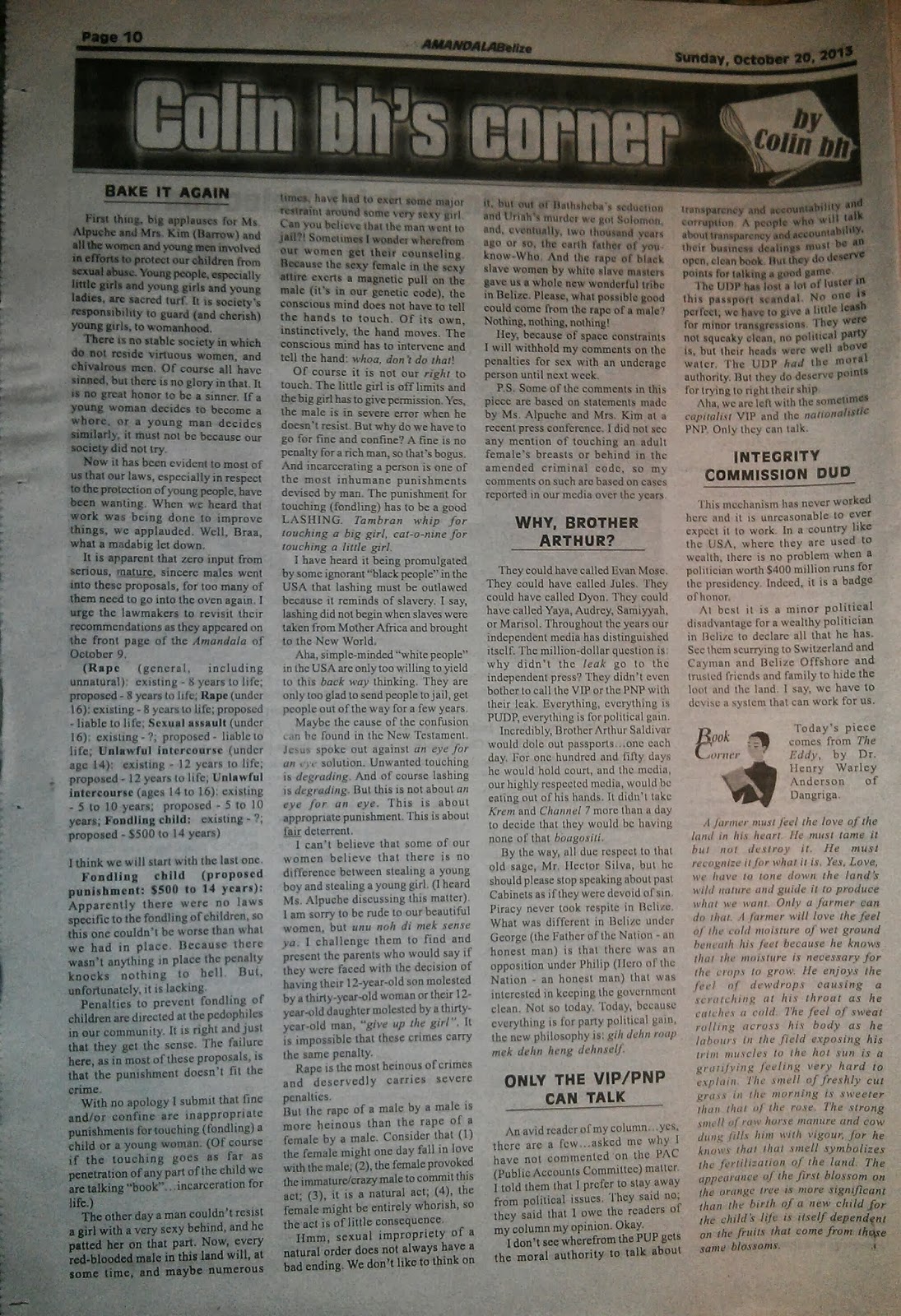 Before I begin here, let me put across a point. I am very rarely surprised and aghast at things that happen in my home country. It has reached the point of desensitisation as I believe it has for many others. That said I was completely caught off guard by yesterday’s piece in ‘Colin’s Corner’ of the Amandala. If you happen to be one of the few people who missed it, (you didn’t miss much) let me refresh your memory; our ever entertaining (gag) guide into the depths of human indecency, Colin Bh regales us with his flawless perception of race, gender and rape politics.